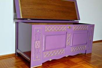 Auch hier kam für die Endlackierung ein transparenter Hochglanzlack unter Zugabe eines Perlmuttpigmentes zum Einsatz, der die Holztruhe bei Lichteinfall silbrig-changierend funkeln lässt. Der geschmackvolle Farbton, mit dem wir lackiert haben, stammt aus der Kollektion der bekannten Marke Flamant-Möbel-Einrichtung und Farbkonzepte. Sein Name: Juis de Raisin.