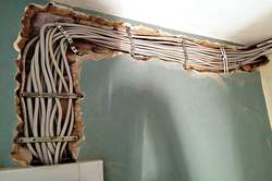 demontiert und entfernt. Dadurch zahlreiche freiliegende Elektrokabel wurden in von uns eigens ausgehobene neue Kabelschächte in den Wandputz eingelegt, in die Wände eingeputzt und bis zur völligen Wandglätte hin neu überspachtelt. Alte Kabelkanäle auf den Wandflächen würden das gute optische Erscheinungsbild von frisch gestrichenen und renovierten Oberflächen erheblich vermindern.
